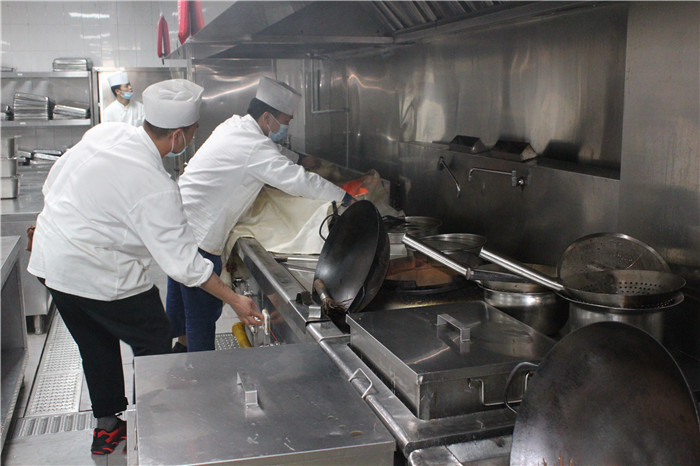 重点演练模拟场景是在一楼厨房间,因一名厨师操作不慎,油锅起火,危及电路、气路。火起时,厨师们立刻启动应急消防程序,关电、关气、盖上锅盖、覆盖上灭火毯、撒上黄沙。