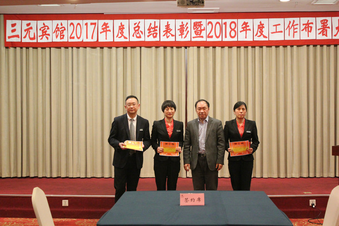 接下来由宾馆副总经理卞瑾同志宣读了2018年宾馆管理人员聘任决定和2017年度优秀管理者、先进员工、先进班组的表彰决定并进行颁奖。各经营部门签订2018年度经济责任书也在大会中进行,更加明确经营部门的各项指标任务,让三元宾馆在经营和管理再上一个新台阶!
