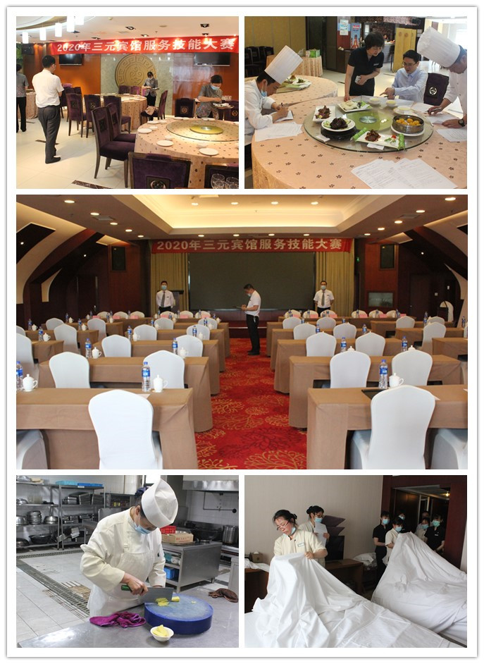 2020年年初,随着一场新冠病毒肺炎疫情的爆发,给全国经济形势带来严重的影响,旅游酒店行业更是重灾区,复工复业后举步艰难。三元宾馆自疫情开始,一段时间暂停营业,员工休息在家,造成经营停滞。从三月份复工以来,受大环境影响,在经营上只能以守业为主,客源少,服务人员提供的服务就相应减少,服务技能水平就会受到影响。“宝剑锋从磨砺出”,剑要常磨,服务技能要常操练,为了保障后续宾馆各岗位的服务质量水平,切实落实今年的全员培训考核工作,同时也为明年宾馆四星复核做好准备,宾馆总经办于4、5月份组织宾馆各部门开展岗位技能大练兵活动,活动成立以总经理室、各部门经理为成员的岗位技能操作比赛工作小组,分为准备、技能操练、比赛评审三个阶段进行。