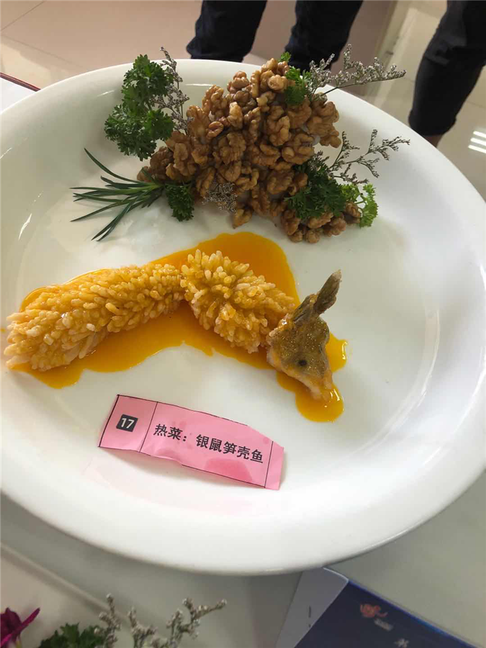 比赛现场,总厨忙而不乱,洗、切、摆,不一会又转战灶台,炉火冲天、菜香扑鼻展示了深厚的厨艺功底。美味的佳肴不仅是几味食材的简单拼凑,而是厨师们精益求精所创造出来的灵魂产物。经过近两小时紧张激烈的角逐,总厨的冷菜苏式熏带鱼”、热菜“银鼠笋壳鱼”完美出品,精美绝伦、富有创意的佳肴让观众大饱眼福并征服了评委,受到评委的一致好评,最后荣获第八届上海市“中华杯”职业技能竞赛长三角总厨中式烹饪项目创意奖。