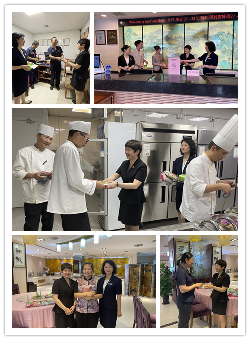 为保证在这酷暑季节员工的身体健康,餐饮部每天自制各类冰饮供宾馆当班员工消暑,宾馆分工会积极策划组织防暑降温慰问活动,并于7月19日在分工会主席沈洁红带领下,分别到宾馆各个岗位上为每个员工送上毛巾、风油精、饮料等防暑降温慰问品,送去夏日的清凉,送去宾馆对员工的关爱。